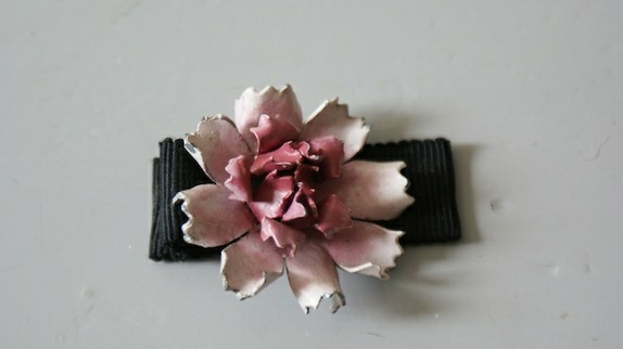 Denne har en gammel metall brosje formet som en nellik i rosa som dekor. Diameter på dekor er 4 cm.