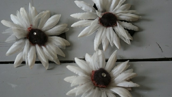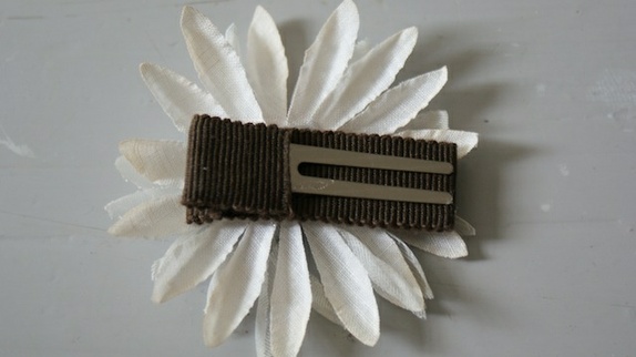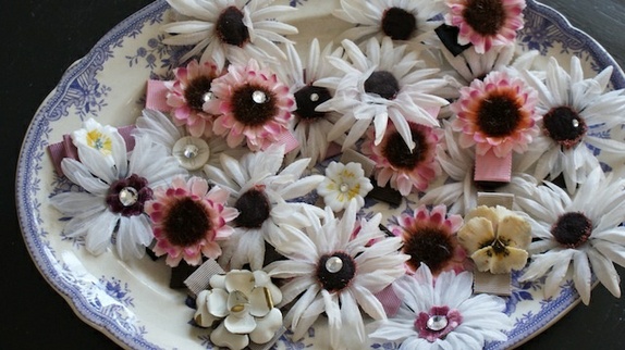 Hårklipp som er trukket med ripsbånd av bomull. Dekoren er forskjellige vintage ting. Spennen sitter godt i alle typer hår.