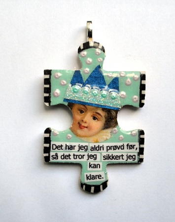 Dette anhenget består av en puslespill brikke som er dekorert med forskjellige ting som feks papir utklipp, servietter og bånd for å skape en liten unik og dekorativ collage. Turkis bakgrunn.