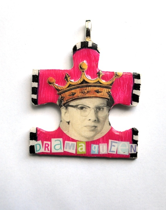 Dette anhenget består av en puslespill brikke som er dekorert med forskjellige ting som feks papir utklipp, servietter og bånd for å skape en liten unik og dekorativ collage. Dyp rosa bakgrunn.