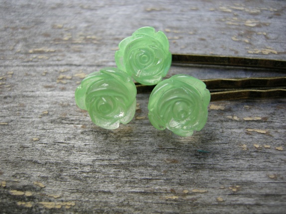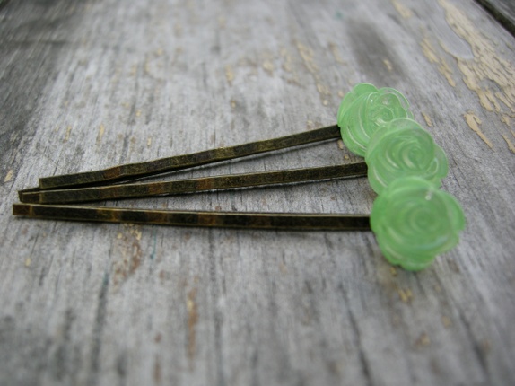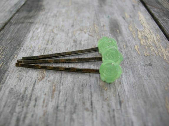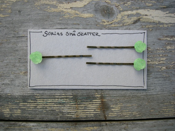 3 nydelige hårspenner med lys grønne roser.Hårnål i oksydert kobber med plastblomster.Limet er profesjonelt smykke lim og etterpå lagt i herder. Hver spenne måler ca 5,5 cm.