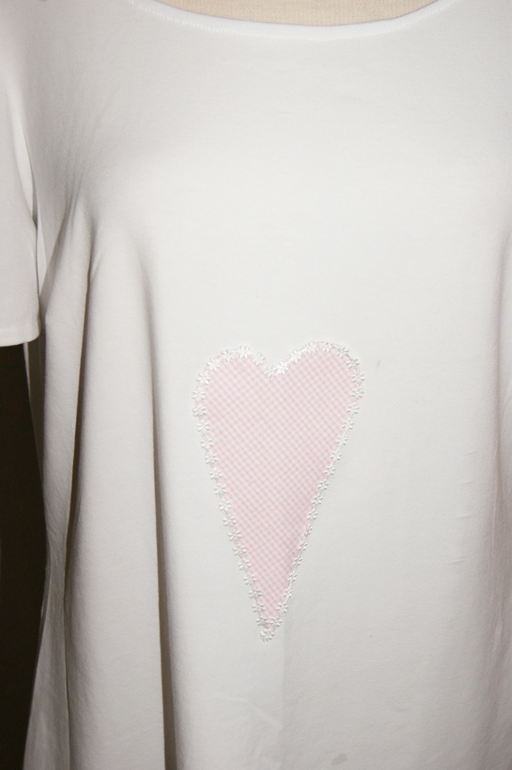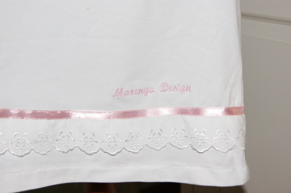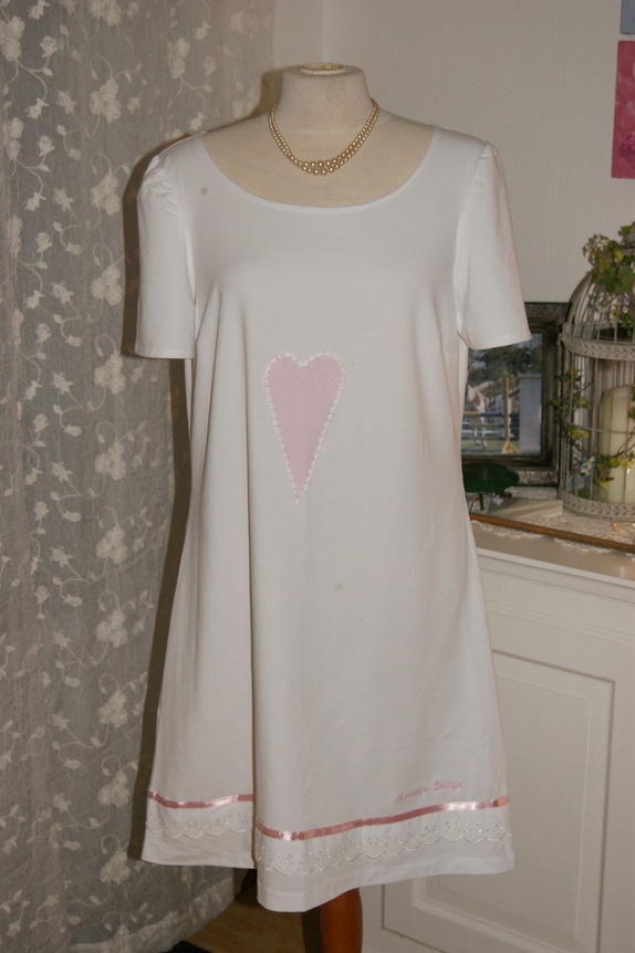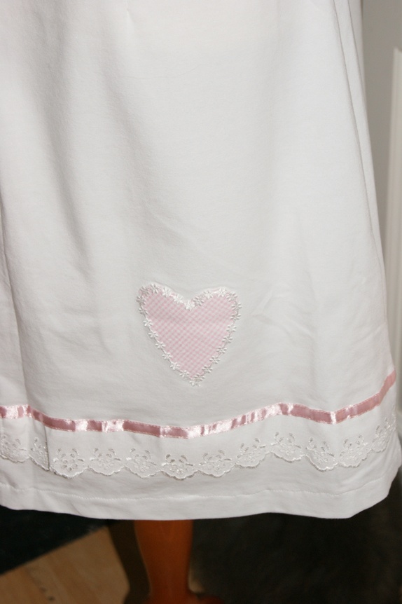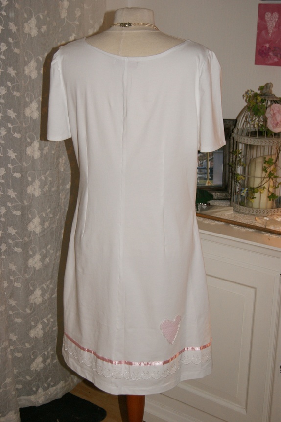 Enkel og lett kjole sydd i tynt jerseystoff.Kjolen er pyntet med bånd og applikasjoner.