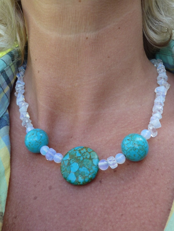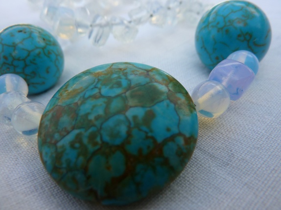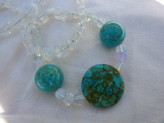Halssmykke av nydelige halv edelsteiner og turkis. Månesteiner i forskjellige nyanser.Karabinlås. Smykke er cm langt.