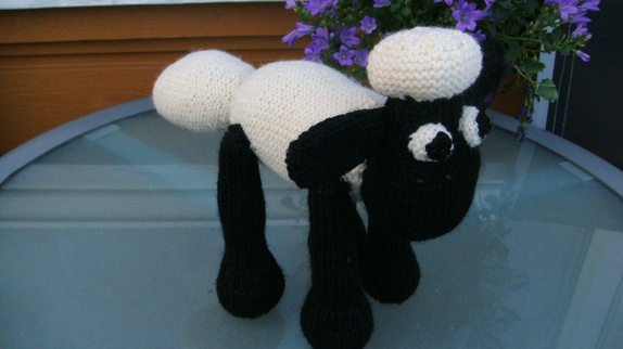 Sauen Shan er strikket i online garn og fylt med hobbyfyll.Shan er ca 19 cm høy og 23 cm lang. Han kan vaskes på 40 grader. Søke ord:Sau,kosedyr.leke