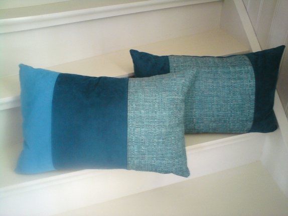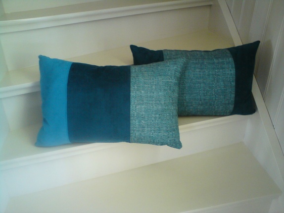 Sydd med glidelås i bunn.Kan vaskes på 30 graderFremste pute på bilde har bakside som bilde 3,pute nr. 2 på bilde har mørk bakside (som sidefeltene)Putene er sydd i de samme stoffene og passer sammen.Prisen er for en pute uten inmat.