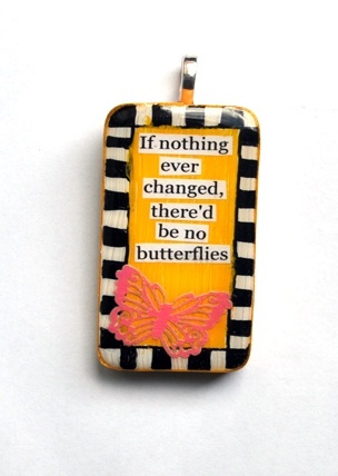Dette anhenget består av en dominobrikke som er dekorert med forskjellige ting som feks papir utklipp, servietter og bånd for å skape en liten unik og dekorativ collage. Overflaten er beskyttet av dimensional lakk som gir motivet dybde.