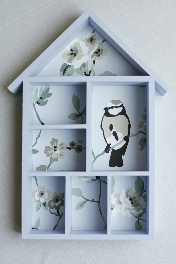 Settekassehus malt lilla, dekorert med kvalitetstapet fra Borås tapeter.