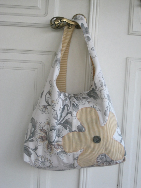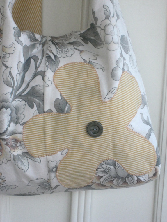 Delikat og søt veske/nett sydd i tykk bomull med blomster, helfòret med stripete solgul bomull. Nettet er pyntet med en stor blomst i samme stoff dom fòret, og en vintage grå knapp.