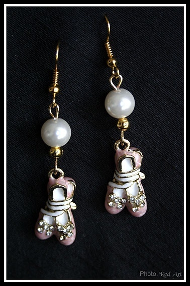 Delikate lysrosa ballettsko med perler og gullfarget metall.