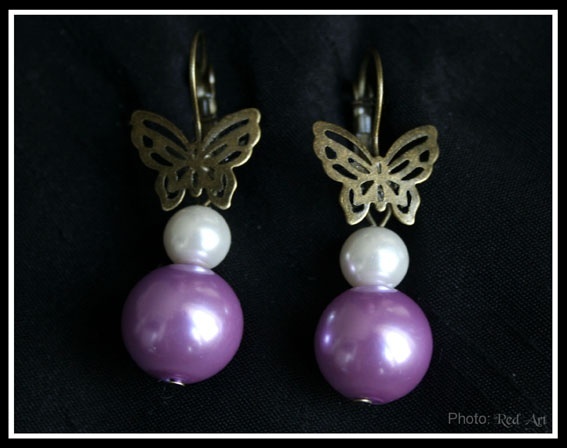 Øredobber med lilla ferskvannsperler og sommerfuglhekter i antikk bronsefarge.