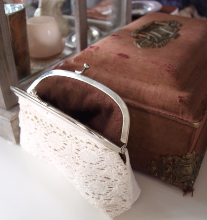 denne portemoneen/vesken er sydd i ubleket lerretmed påsydde gamle blonder.Foret med brunt filtstoff.Vliselin mellom lagenebredde: 16 cmhøyde: 14 cm