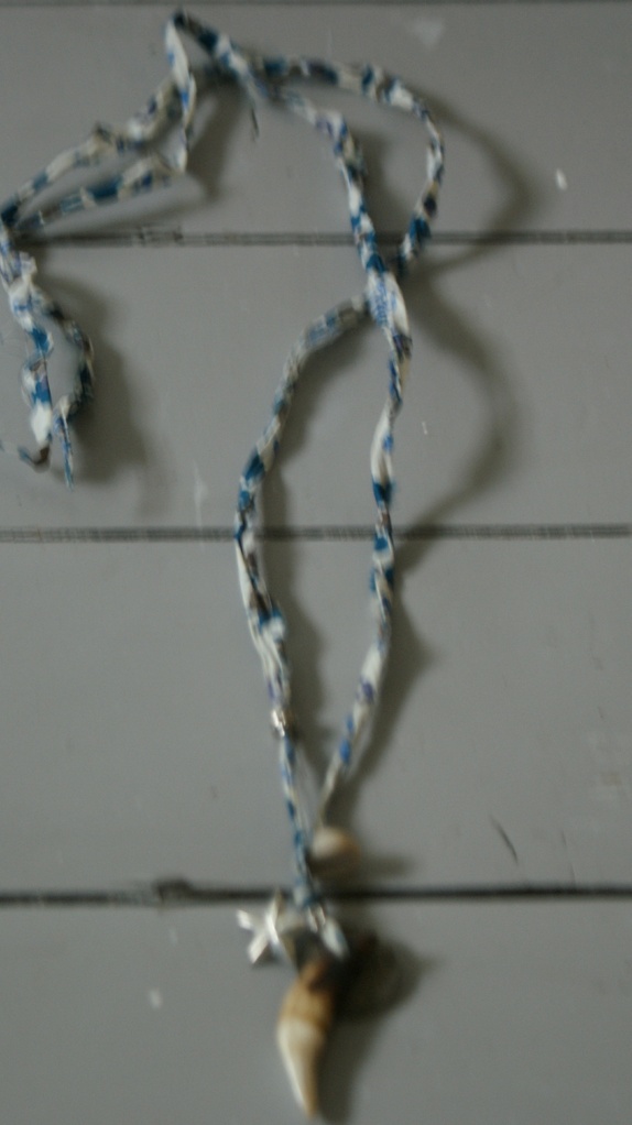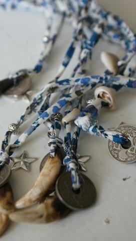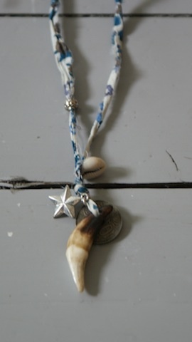 Liberty tekstil med en horn tann, stjerne i sølv, skjell, sølvperle og en Fransk 10 c fra 1933 på.