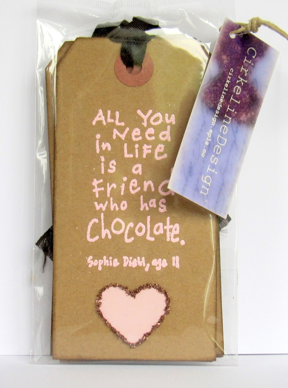 Teksten på lappene er embosset (forhøyet) i sukkertøyrosa farge og lyder som følger: "All you need in life is a friend who has chocolate". Kantene er svertet for en "vintage look". Nederst er det et rosa hjerte med brunt glassglitter rundt. På baksiden av lappene er det stemplet "To" og "From", og det er plass til en personlig hilsen. Gavelappene har sjokoladebrune sløyfebånd.