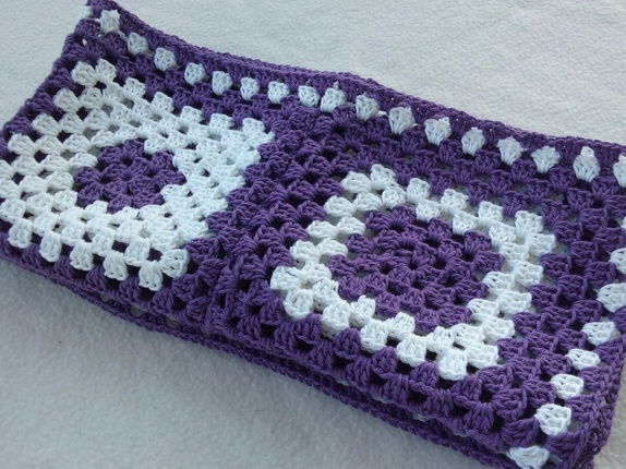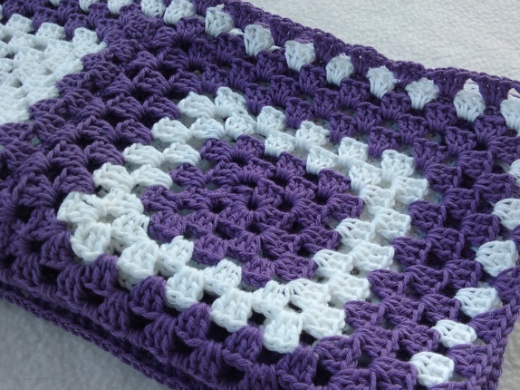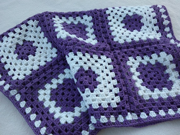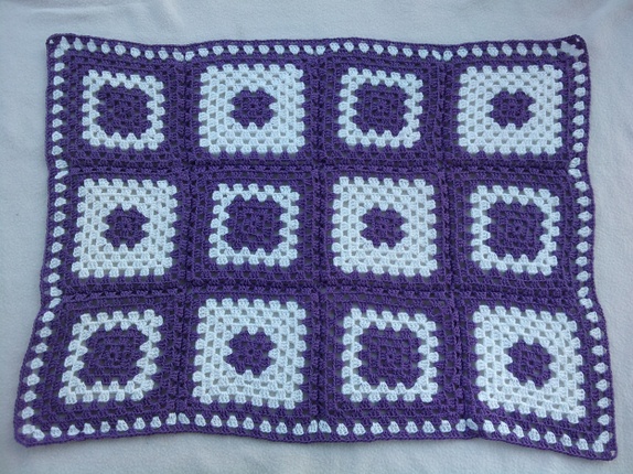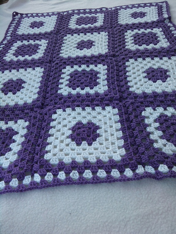 Heklet teppe i lilla og hvitt, 100 % bomullsgarn.
