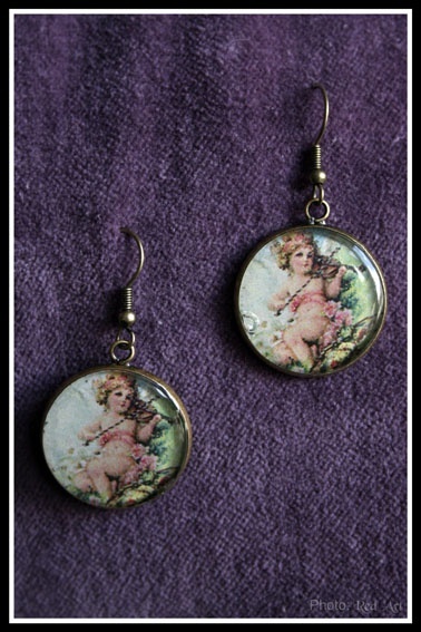 Øredobber i antikkfarget bronse med bilde av en liten engel som spiller fiolin. Fargene går i lys, dusgrønn, hvitt og lysrosa.