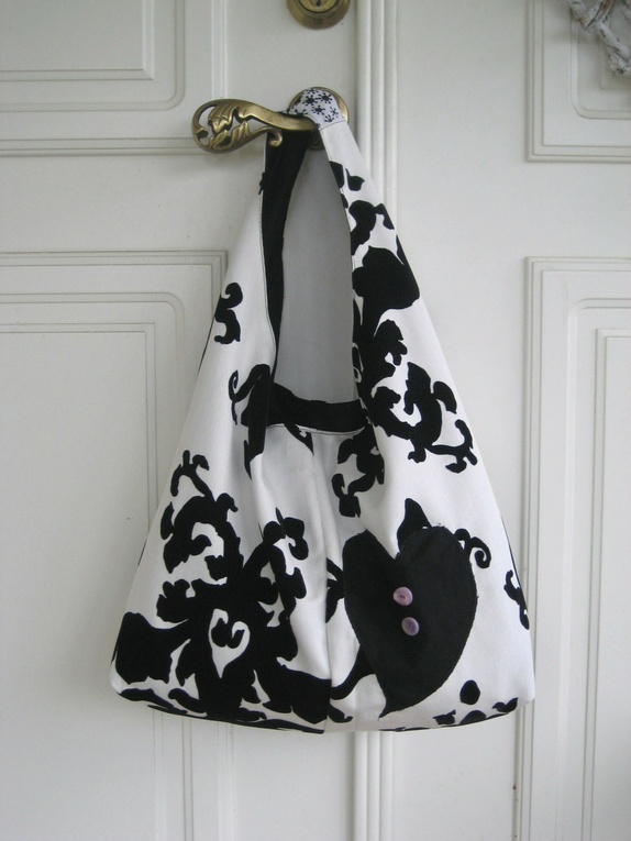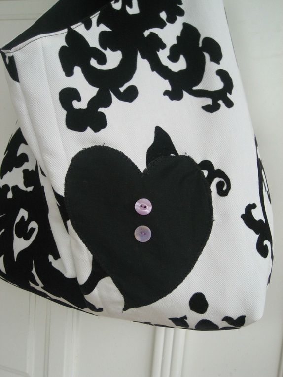 Stilig veske/nett sydd i robust hvitt stoff med sort fløyelsmønster, helfòret med sort bomull. Nettet har et sort hjerte, pyntet med 2 lilla knapper.