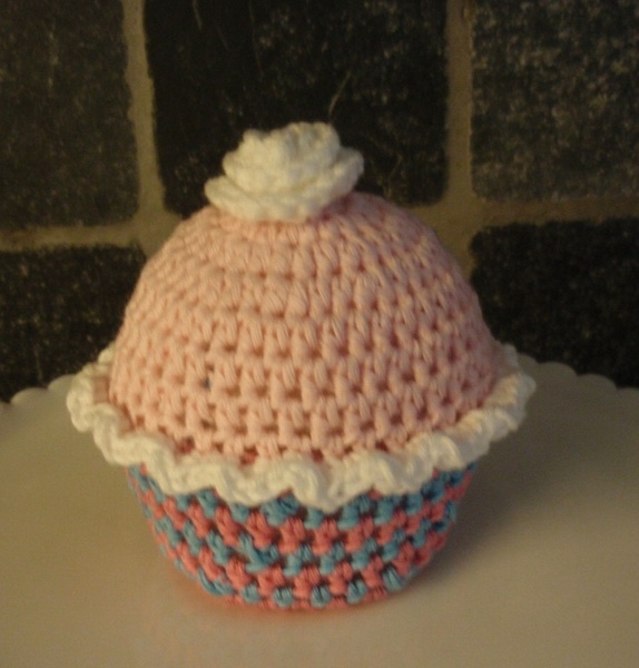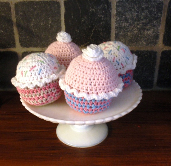 Cupcake er heklet med bomulsgarn og fylt med putevatt, det er ingen små deler som perler eller lignende på denne så det er ikke farlig for de søte små å leke med denne:)