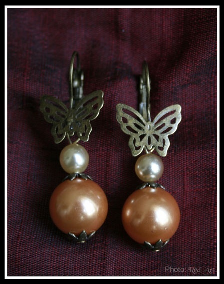 Øredobber med gyldne ferskvannsperler, liten kremfarget perle og sommerfugl i antikkfarget bronse.