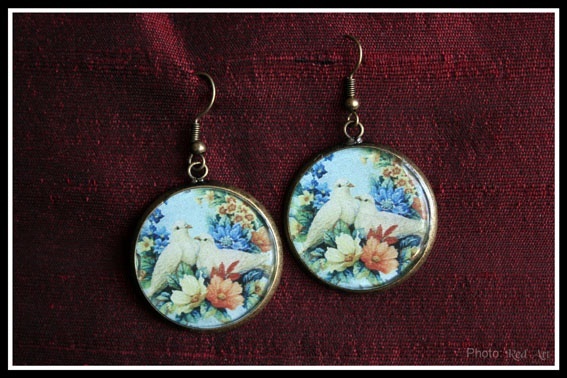 Runde øredobber med nydelig bilde av to duer og blomster. Antikkbronsefarget metall..