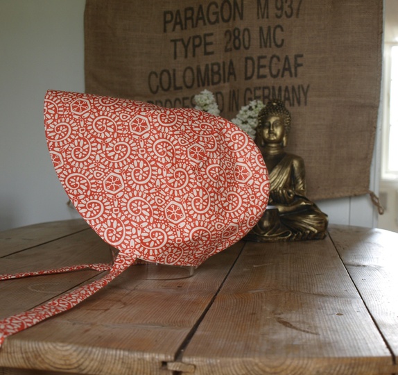 Denne solhatten ( også kalt bonnet, kyse)er sydd i nydelig Kathy Spain for Moda stoff, foret med ubleket lerretstoff ingen synlige sømmer på innsiden.Vliselin på kanten som kan brettes..Vaskes 30 - 40 grader.Str. 86 - 92 cl.2 -3 år