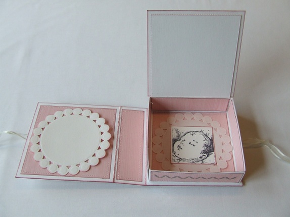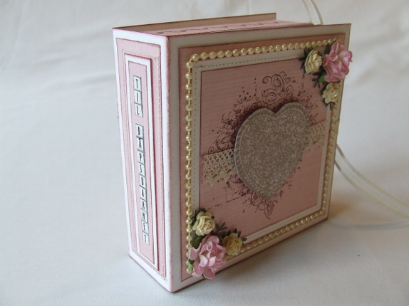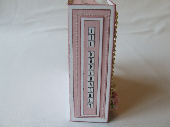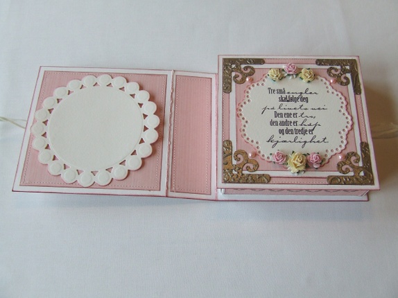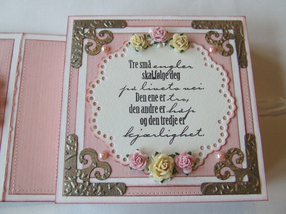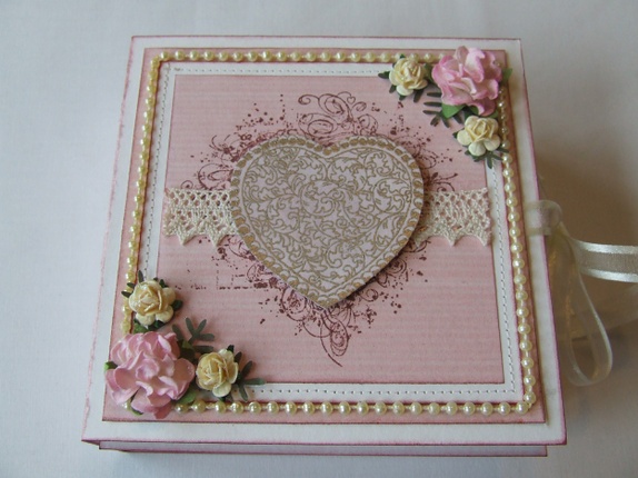 Pyntet med mønsterpapir, perlebånd, halvperler, roser, blonde,glitterlim maskinsøm og stempel.