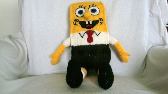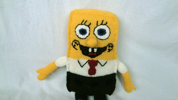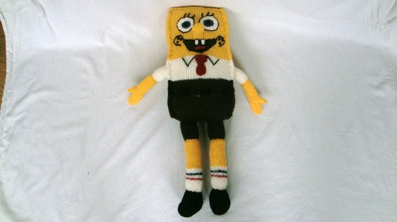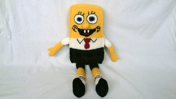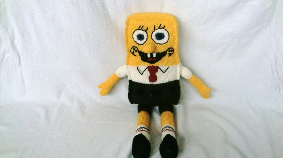 Svampebob er 53 cm lang ,bredden er 17 cm. Buksen er mørk brun ,det kommer ikke så godt frem av bildet . Munn og øyne er brodert.øynene er blå,sorte og hvite..Munn er brun,rød og sort.Bør håndvaskes. Søke ord : kosedyr,dukke.leke.tegneserie figur.