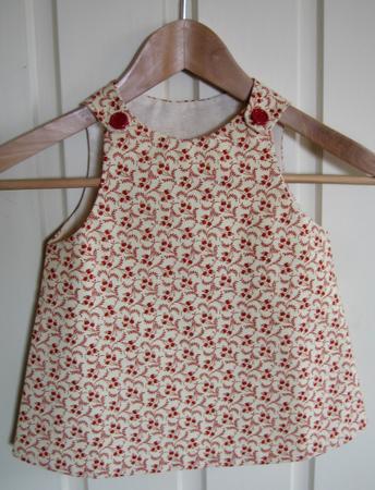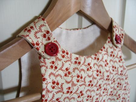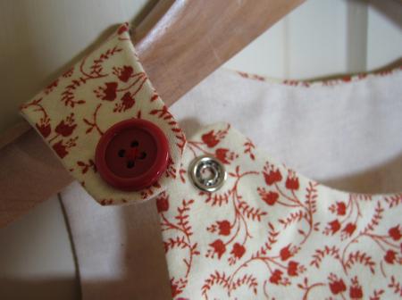 Denne Majakjolen er sydd i et vintage bomullsstoff trykt med røde blomsterslynger. Her har jeg brukt trykknapper til feste, men pyntet med vanlige røde knapper utenpå trykknappene. Fóret er ubleket bomullslerret i 100% bomull.
