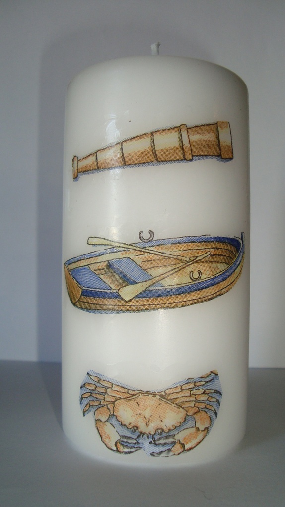 Dekorert stearinlys med motiv som er smeltet inn i lyset.