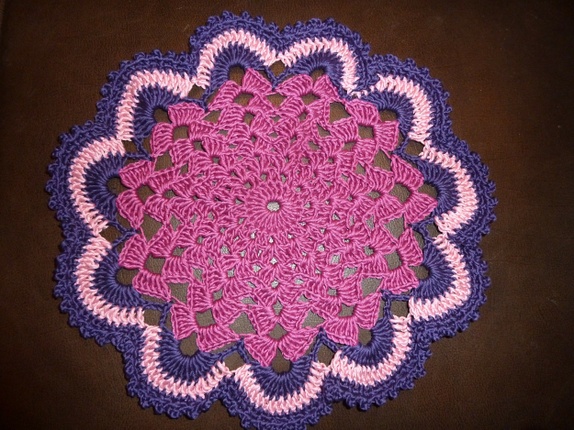 Heklet brikke i bomullsgarnLilla ,cerise og rosafarger .ca 25 cm i diameter