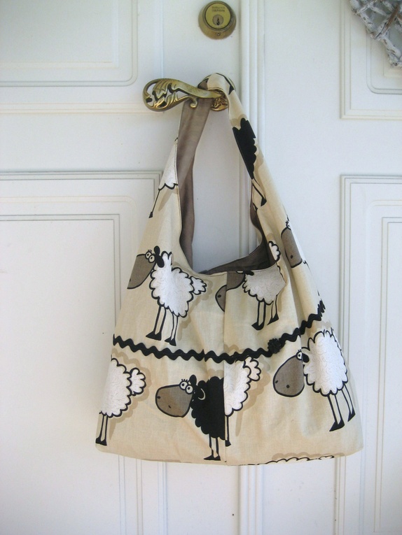 Morsom vekse/nett sydd i bomulle med sauer, helfòret med beige bomull. Nettet er pyntet med sort kroklisse og en sort vintage knapp