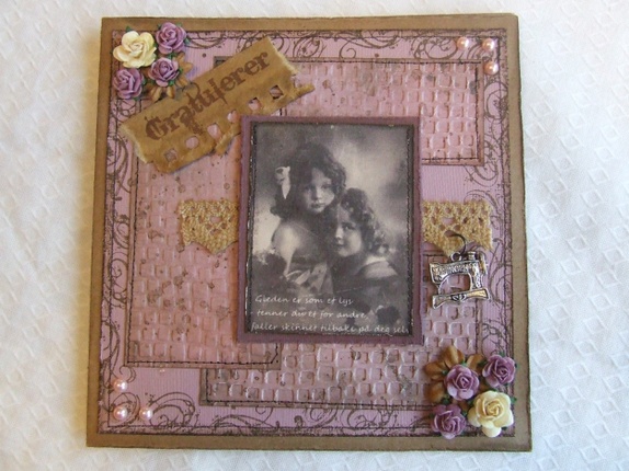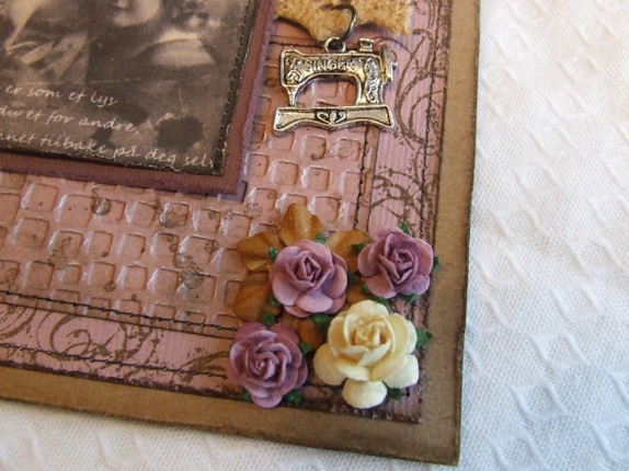Pyntet med vintagebilde, blonde, gråpapir, stempel, roser, metallpynt, maskinsøm og halvperler.