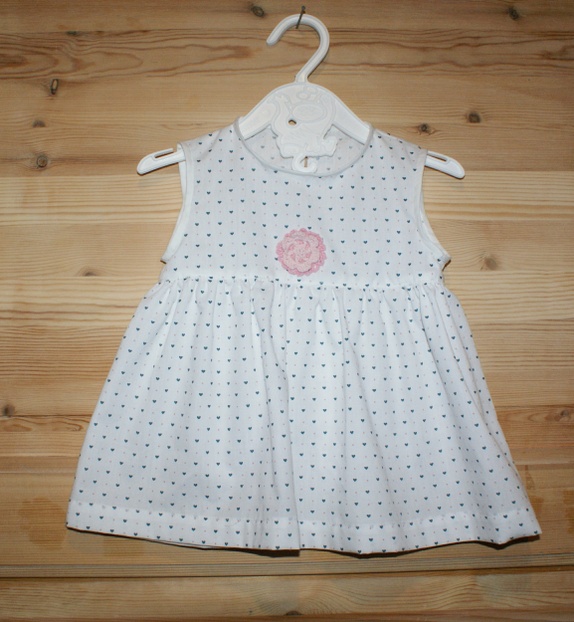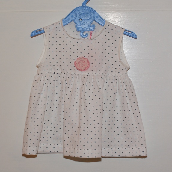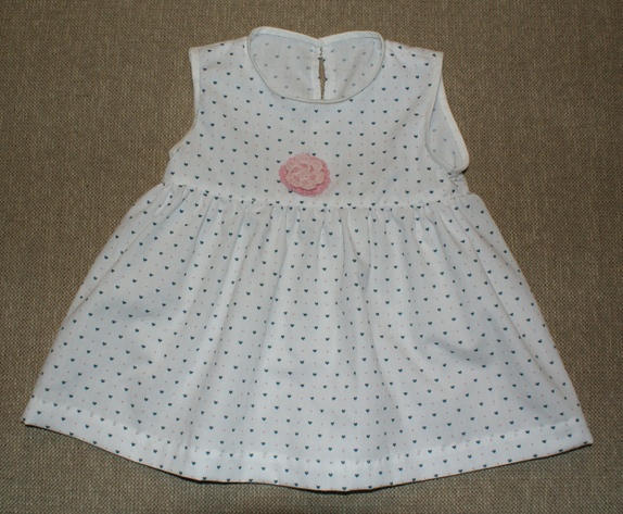 Søt kjole i tynt, mykt stoff med små hjerter. Kantet med skråbånd i hals og ermeutringninger. Kjolen har splitt bak og lukkes med en knapp i nakken. To heklede blomster pynter opp midt foran.