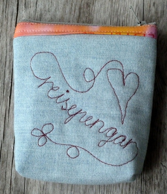 Pung i dongeri m/ applikert flymotiv og frihandsbrodering/tekst ("reisepengarl") på baksida.