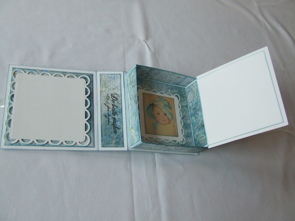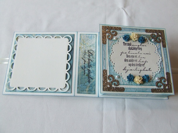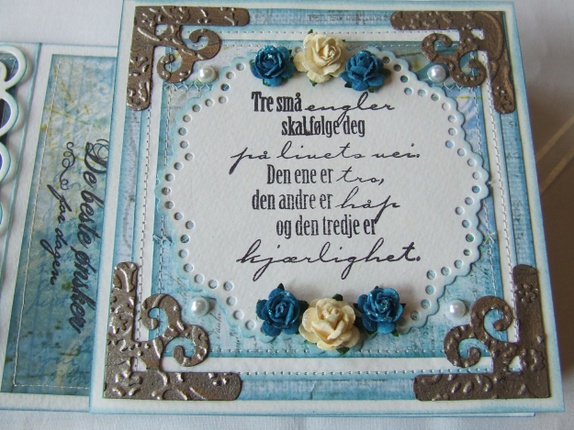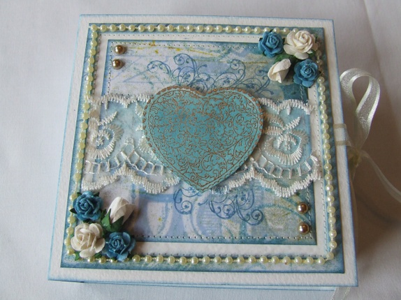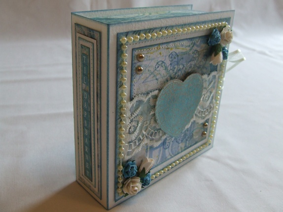 Pyntet med mønsterpapir, perlebånd, halvperler, roser, blonde, glitterlim, maskinsøm og stempel.