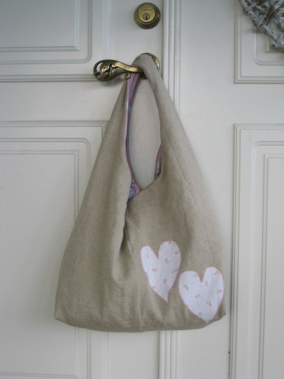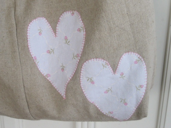 Skjønn veske/nett sydd i lin, helfòret med en rosa bomullsduk. Nettet er pyntet med 2 hjerter i romantisk bomull med rosenknopper.