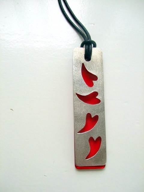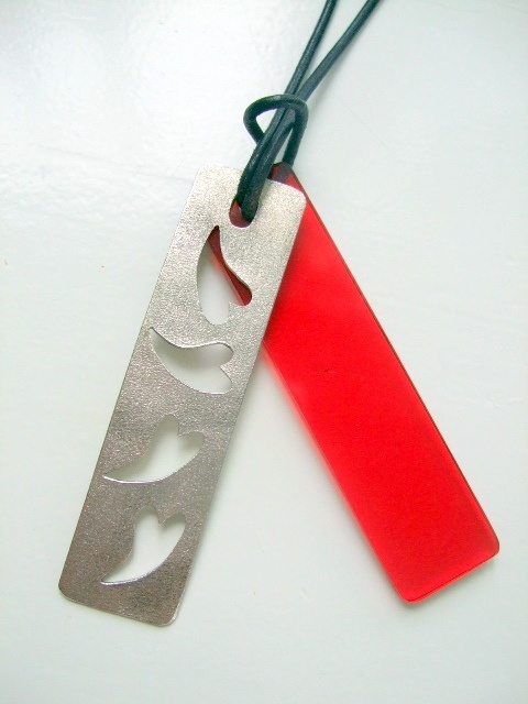 Halssmykke bestående av en sølvplate med hjerter og en plate i rød plexi som er satt sammen av en skinnsnor med jutserbar lengde.