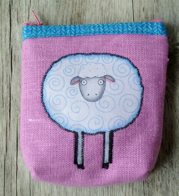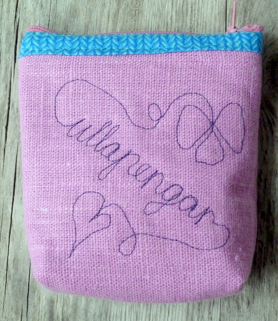 Pung i lin m/ applikert sauemotiv og frihandsbrodering/tekst ("ullapengarl") på baksida.