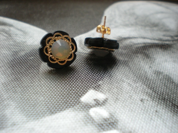 Sorte øredobber med gulldetaljer og glitrende swarovski-stener.