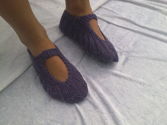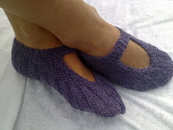 Myke og gode lommetøfler strikket i alpakkagarn, kjekke og ta med seg bort eller som en liten gave til noen. kan brukes sommer som vinter.farge lilla.Str. 35-37 19-22 cm.