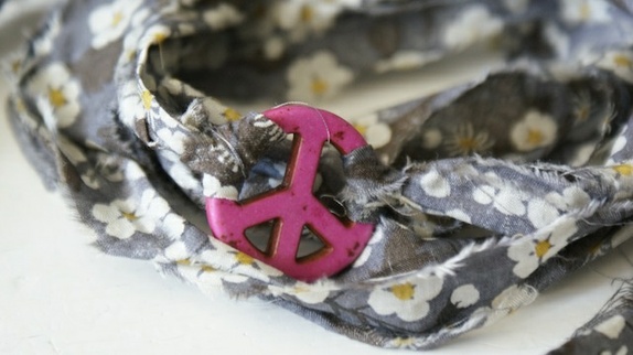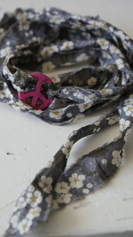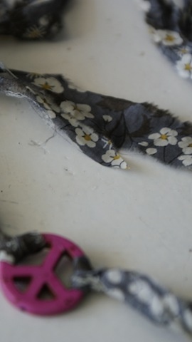 Peace tegn av ben i rosa, diameter 2,5cm. Liberty tekstil ligger dobbelt og er 62 cm lang på HVER side.