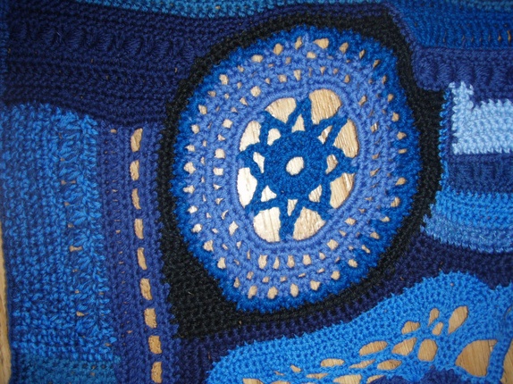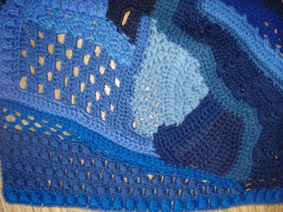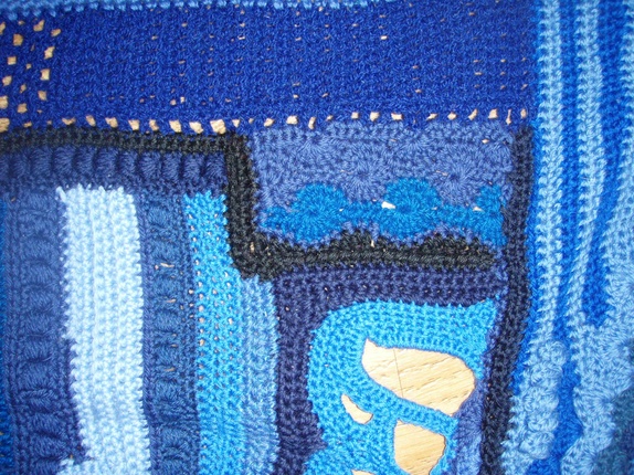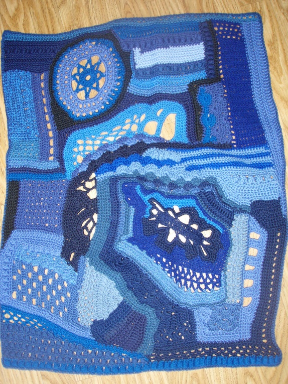 Teppet er laget i blånyanser.Teppet er laget i frhekling, det er derfor ikke helt firkantet.