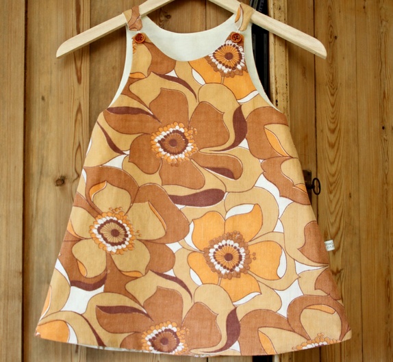 Kjolen har et nesten like stilig fór, i kremhvitt bomullsstoff med brunt mønster. Oransje vintage knapper som festes med strikkhempe over skulderen.