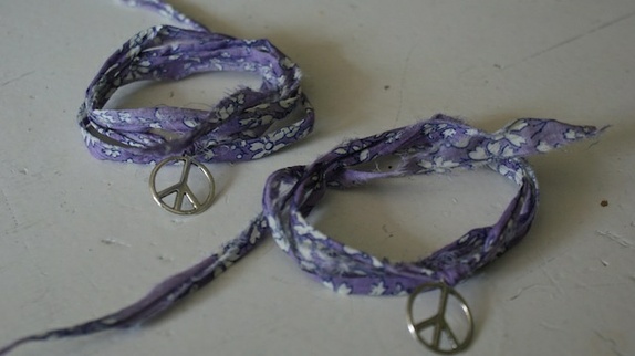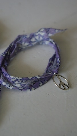 Tøffe armbånd av revet Liberty tekstil med sølv peace tegn, diameter på 1,6cm. Sno tekstilen rundt håndleddet og knyttes.