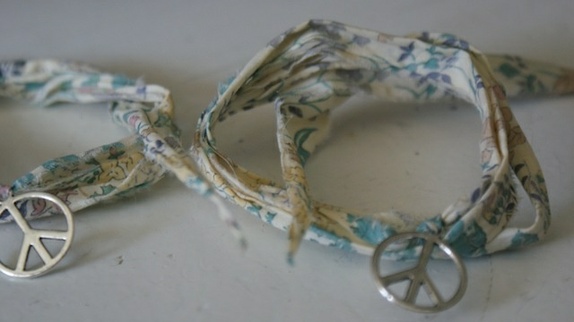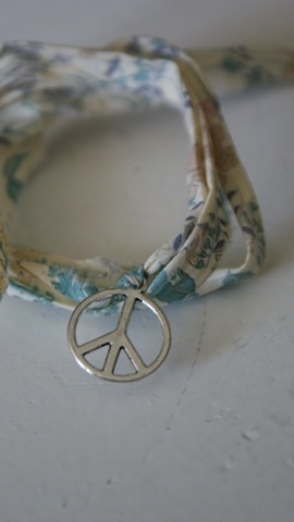 Tøffe armbånd av revet Liberty tekstil med sølv peace tegn, diameter 1,6 cm. Sno tekstilen rundt håndleddet og knyttes.