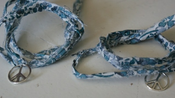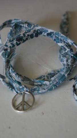 Tøffe armbånd av revet Liberty tekstil med sølv peace tegn, diameter 1,6cm. Sno tekstilen rundt håndleddet og knyttes.