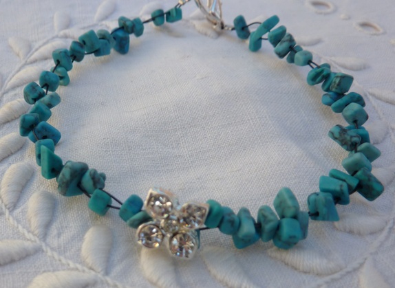 Armebåndet er laget av små steiner, turkis med en nydelig mellomdel.Karabinlås.23,5 cm langt.