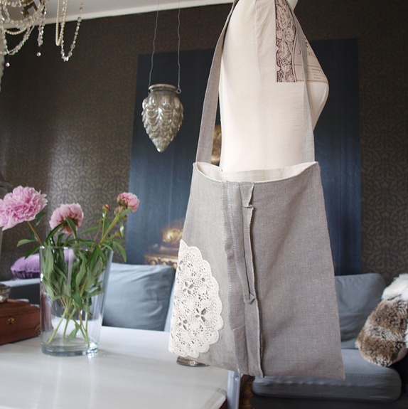 Veske/nett sydd i forvasket lin,foret med bomull.Ingen synlige sømmer på innsiden.Påsydd mormors gamle heklebrikke og rysjer.Bredde: 34 cmHøyde: 38 cmhank: 80 cm