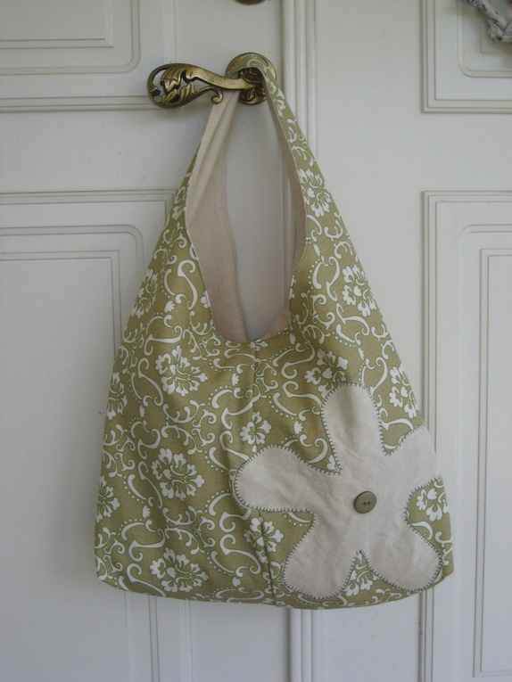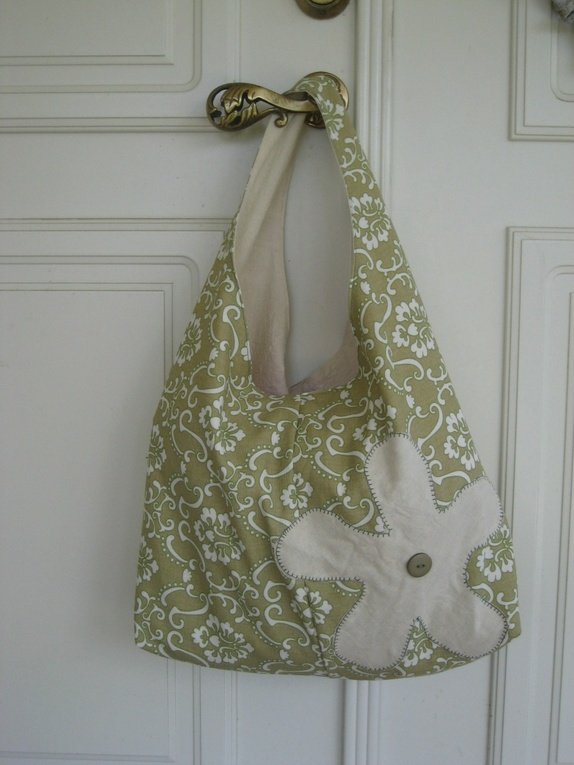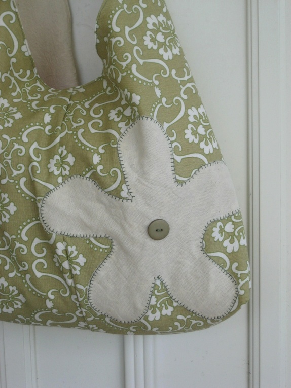 Flott veske/nett sydd i robust dus grønn, mønstret bomull, helfòret med krinklet offwhite bomull. Nettet er pyntet med en stor blomst med knapp.