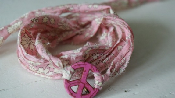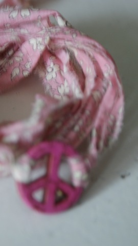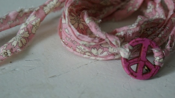Peace tegn av ben i rosa, diameter 2,5cm. Liberty tekstil ligger dobbelt og er 62 cm lang på HVER side.