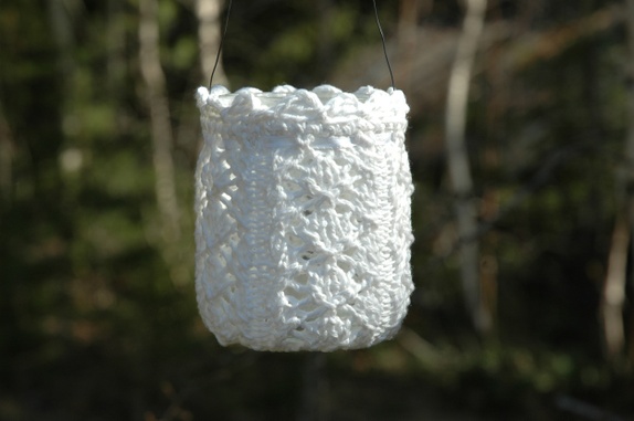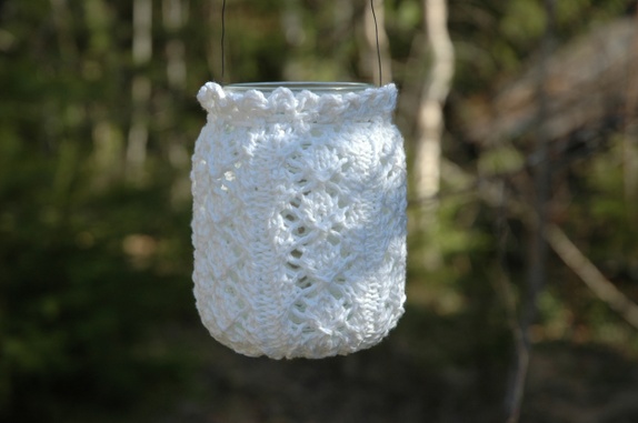 Lykt for telys. Laget av syltetøyglass kledd med strikket trekk.